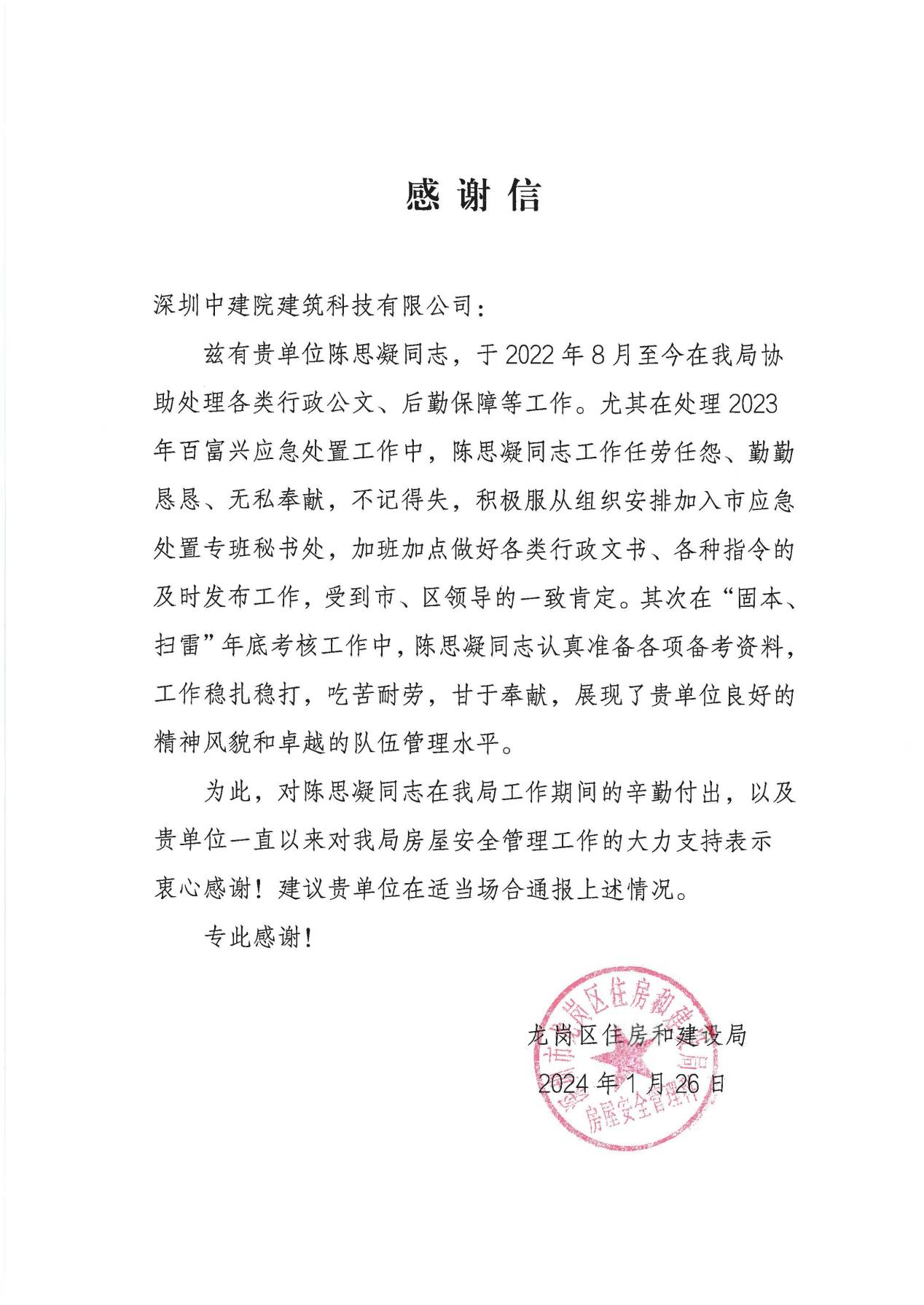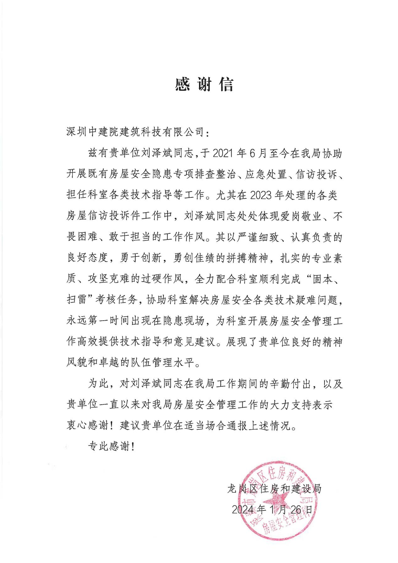 近期,深圳中建院建筑科技有限公司(以下簡稱“深圳中建院”)收到深圳市龍崗區(qū)住房和建設(shè)局發(fā)來的感謝信,對深圳中建院多年來在房屋安全管理工作中的大力支持表示感謝,對劉澤斌、陳思凝兩位同志的辛勤付出提出表揚(yáng)。