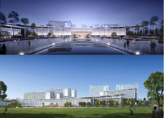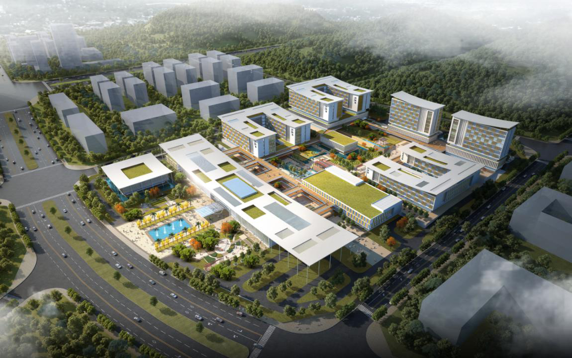 本項目總體設計理念以“嶺南聚落,山水醫城”為設計思路,彰顯嶺南聚落、濱海之水的地域特色,構建門診街和住院街的空間結構;引入生態節能技術,打造“放眼亭——花溪疊瀑——碧波觀景——竹香廊——嘯月臺——芍藥坡——紫藤塢”等一系列主題園景,用醫養新城與水源聚落進行布局上的呼應與尺度上的對比,突出地域人文特點,展現現代醫療產業的人文關懷。