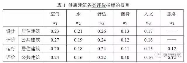 第3.2.7條規定了《標準》中各評價指標的權重?!稑藴省吩诟髦笜藱嘀匮芯恐校?ldquo;抓主因、顧次因”的原則充分考慮了不同類型的民用建筑的健康影響因素,并按照民用建筑的分類,建立了居住建筑和公共建筑指標權重的調研問卷,采用問卷調查、層次分析、專家咨詢、項目試評等多途徑結合的方式,建立了健康建筑各類評價指標的權重,見表1。